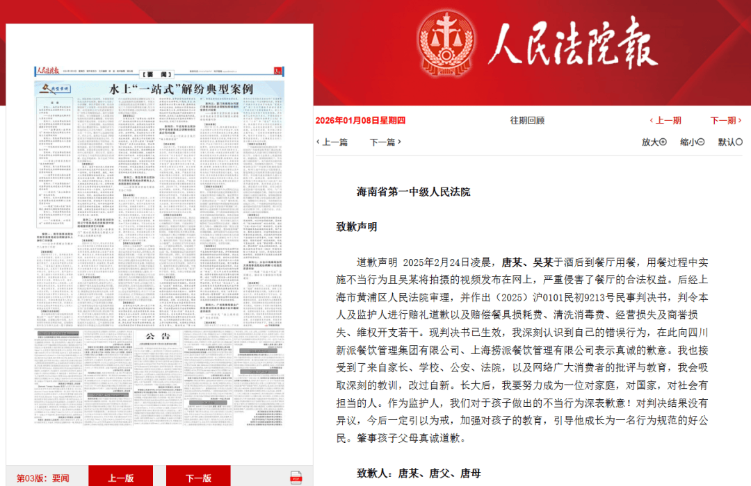 ◆据封面新闻消息,企查查APP显示,1月8日,人民法院报刊登海底捞小便当事人及其父母道歉声明。