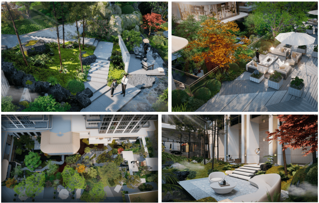 项目以 “生息山河” 为核心,沿景观视线错落铺展形成 “高低楼台” 布局,横向75m下沉庭院,做出多个标高的高低错落台地,营造立体山水游园场景。