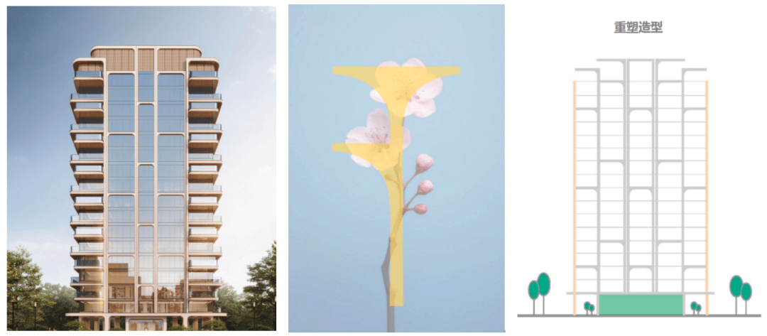 项目汲取金陵文脉,提取云锦等元素,以真石材、香槟色金铝型材、玻璃的立面交织,搭配南京市花 “梅花” 造型弧线,打造颜值立面美学。
