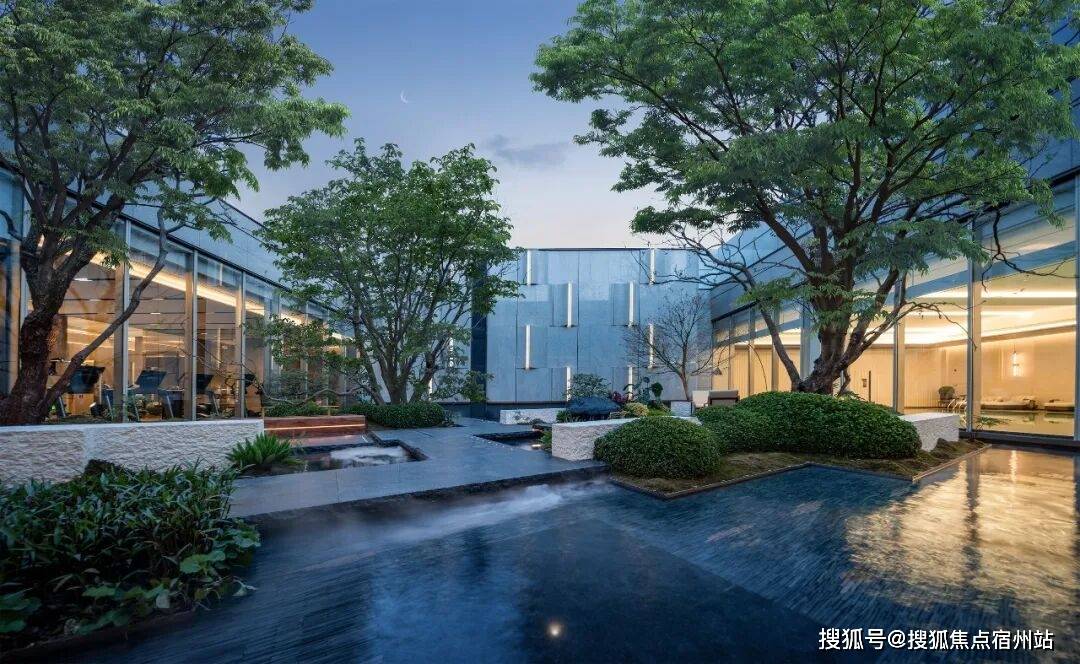 会所还拥有下沉水景庭院,与周围建筑融为一体,以静水、原石、浮桥、古树、自然微地形为精神媒介,将自然与松弛感带给社区。
