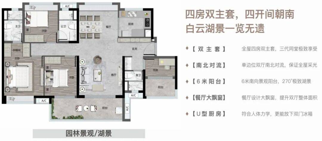 项目整体采用围合式楼栋布局,可以最大程度看白云湖,直接把一线湖景,搬进了业主家中。