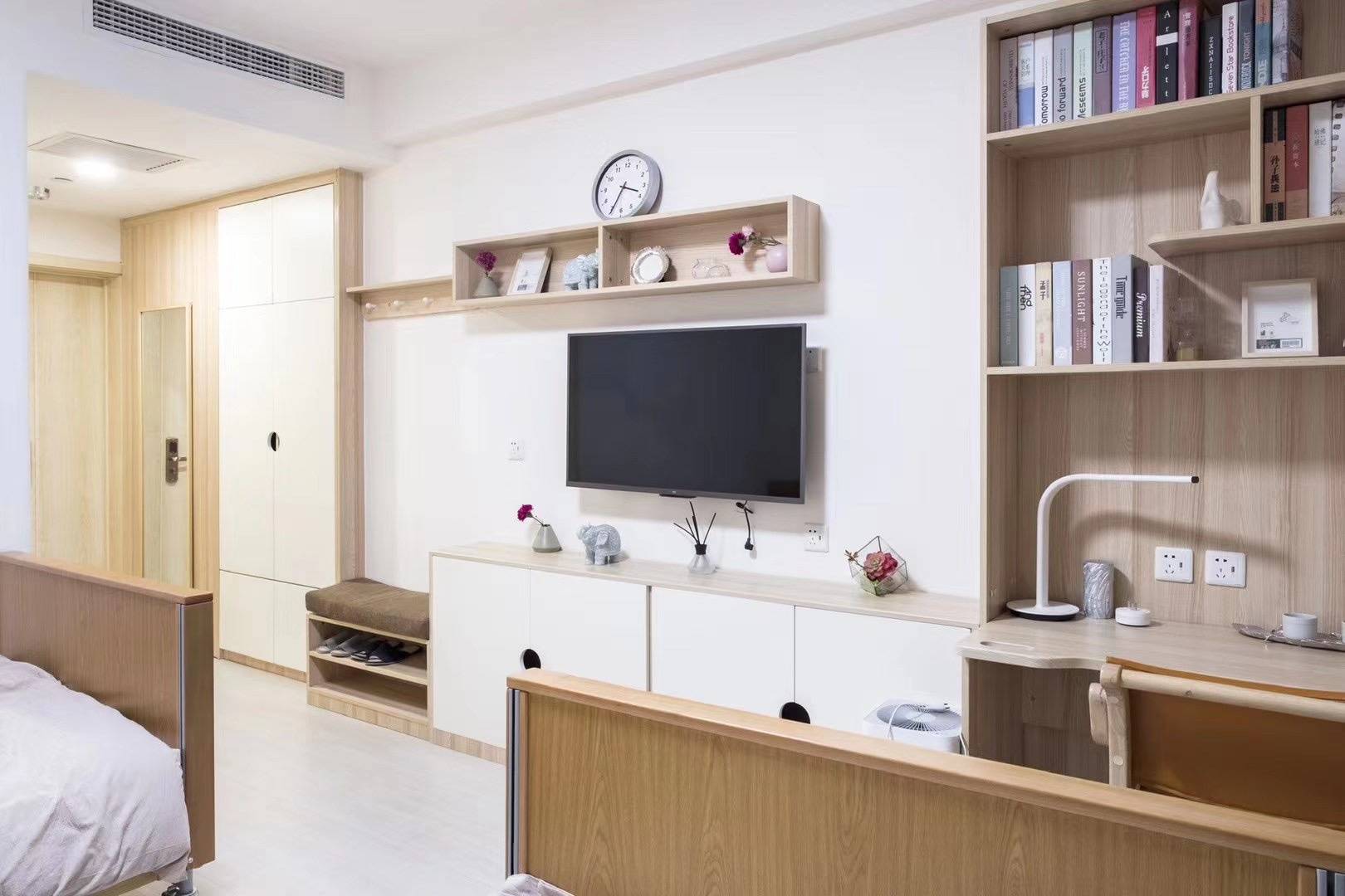 项目分三期建设,循序渐进打造完善的康养配套。一期工程涵盖二级综合医院——京北医院、护理中心和颐养公寓,其中护理中心位于京北医院9至13层,设置VIP豪华间、单人间、双人间和三人间,床位共计200余张,可专业接收失能、半失能长者。所有房间均为精装修,内部配备氧气、负压、紧急呼叫和电动护理床等专业养老设备,每层还设有公共活动区域、休闲区、助浴室和洗衣房,全方位满足长者的日常生活与休闲需求。颐养公寓则规划有724套居室,1500张床位,涵盖一至三居室多种户型,均为精装修交付,配备SOS紧急呼叫系统,满足活力长者的休闲养生、旅居或长期康养需求。同时,一期还配套建设老年大学、营养餐厅、温泉会所等,丰富长者的精神文化生活与日常生活便利。