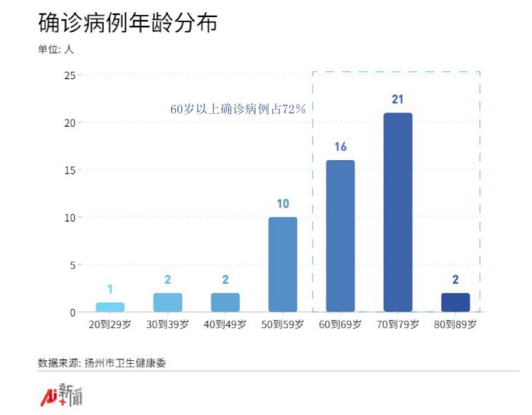 在本轮扬州市新增的本土确诊病例中,60岁以上老人占比较大,截至8月1日24时,扬州发现的54例本土确诊病例中,39人年龄大于60岁,年龄最大的为87岁。60岁以上老年人疫苗接种起步晚,当前疫苗覆盖率较低,但老年人又是高危人群,重症率高。老年人口较多、确诊人群年龄偏高的局面,也确实给当前疫情防控带来了挑战。因此,老年人更应该成为疫情防控的重点。积极行动、全面部署,采取多种形式为老年人宣传防疫知识,为老年人生命安全和身体健康提供保障。